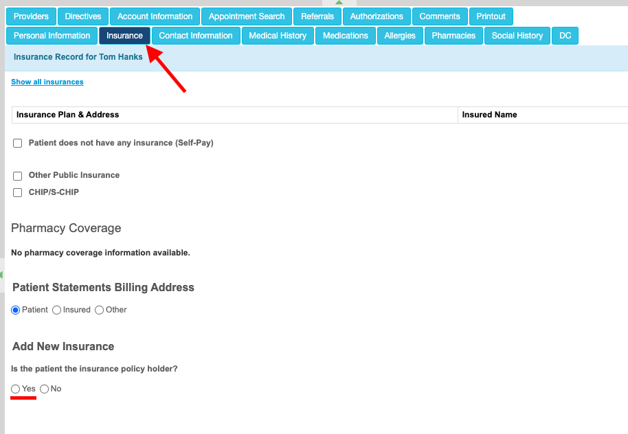 - For the Add New Insurance, select Yes.