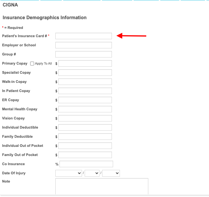 - Enter the Patient’s Insurance Card number and fill out the rest of the information (e.g. copays).