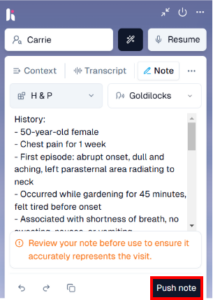 8. Click Push Note to insert the generated summary into the AI HPI page of the EMR note automatically.