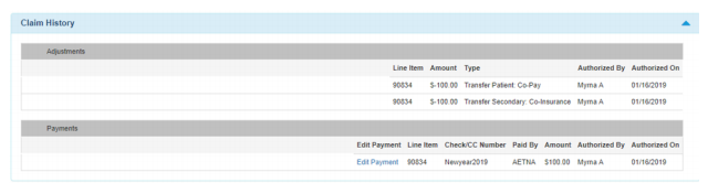 - Claim History – shows the history of adjustments and details of the check entered into the system for the payment