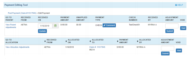 - Selecting the Edit Payment link pulls up the Payment Editing Tool