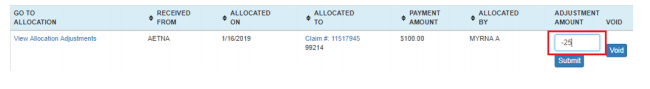 in the Adjustment Amount field- Example: the payment for 99214 should only be $75, but it was incorrectly entered at $100. Enter the amount to deduct in the Adjustment field and hit Submit