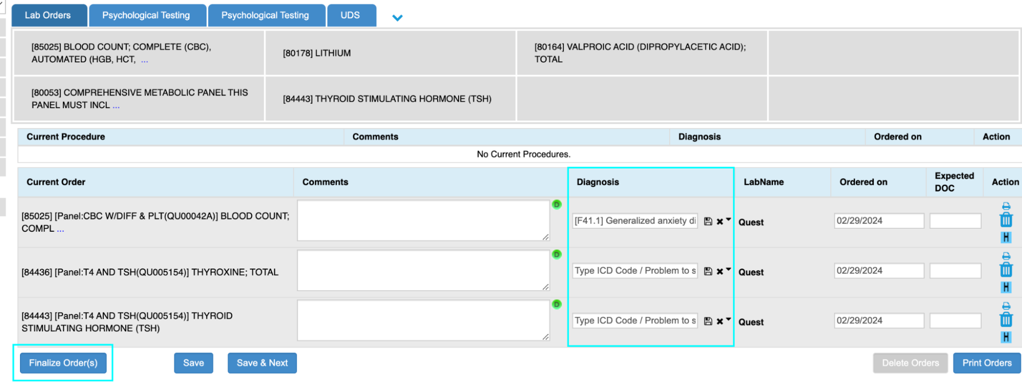 - Users may add 1 diagnosis to an order if its applicable to all orders