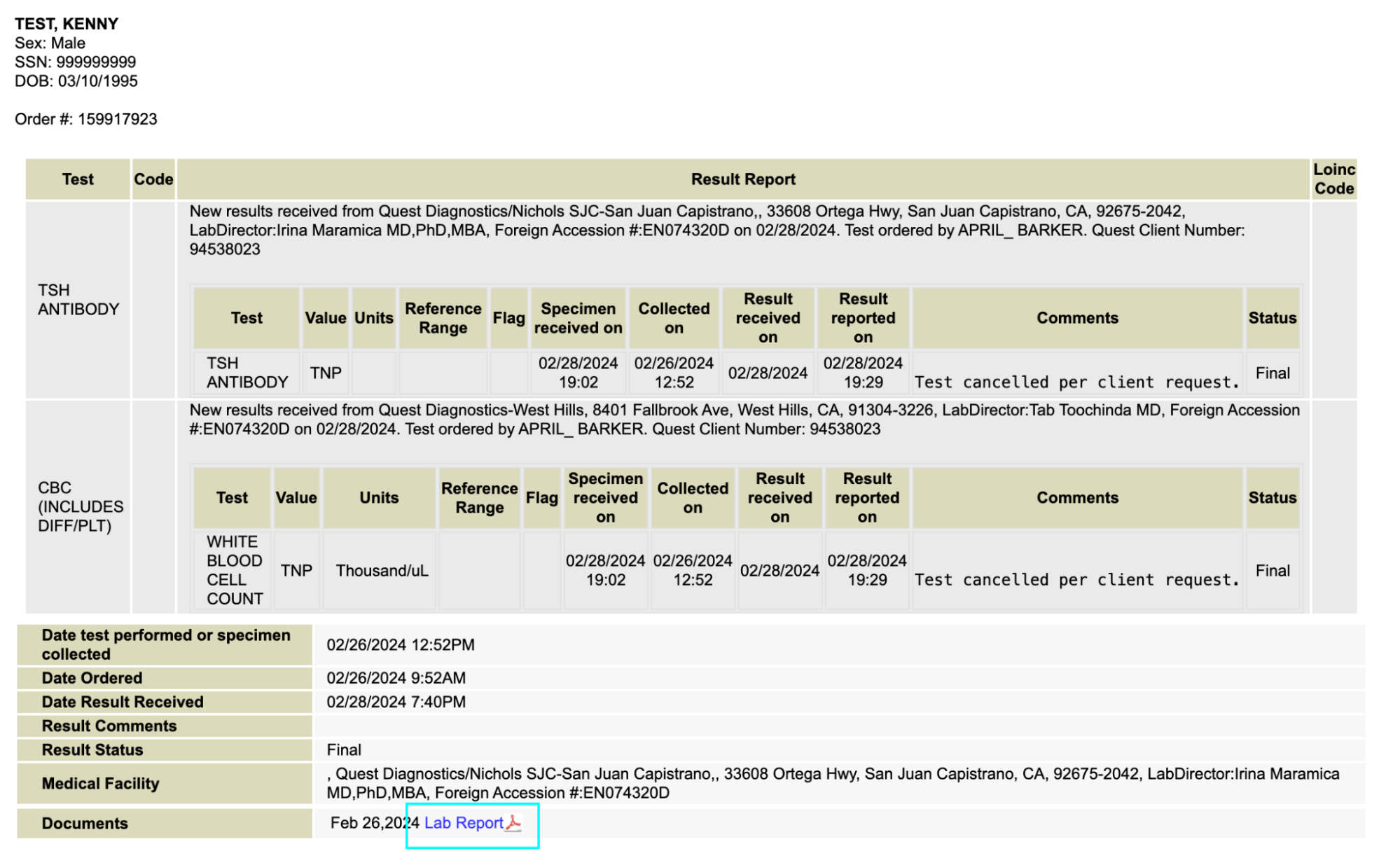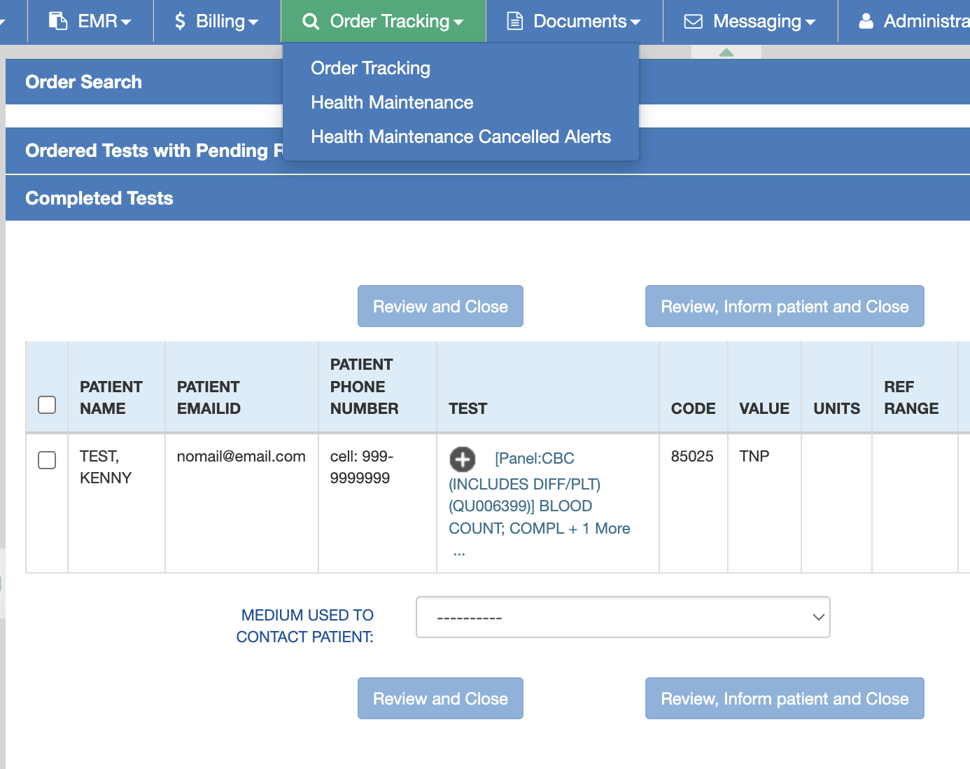 - Once test results are received electronically from the lab, lab order status in Order Tracking > Order Test with Pending Results will automatically move to Completed Tests.