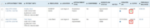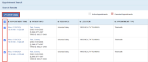 1. From the appointment search result, select the check box for the accounts you want to collect copays for, or select the checkbox at the header (Select All) to collect from all the patients listed.
