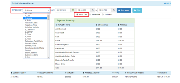 - Select ‘Full Day’ and choose your name from the list, click Run Report