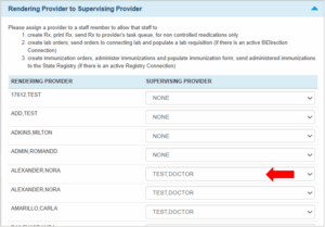 If the ancillary staff or mid-level provider has already been assigned to a Supervising Provider, that provider will appear pre-selected in the “Supervising Provider” dropdown. This ensures quicker delegation for routine workflows.