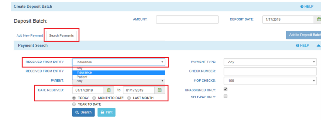 - Select “Insurance’ in the RECEIVED FROM ENTITY drop down menu. Select the date receive and select the Search button