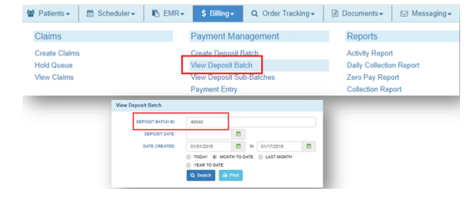 - You can review the batch by going to BILLING → PAYMENT MANAGAMENT → VIEW DEPOSIT BATCH and entering the deposit batch ID number, select search