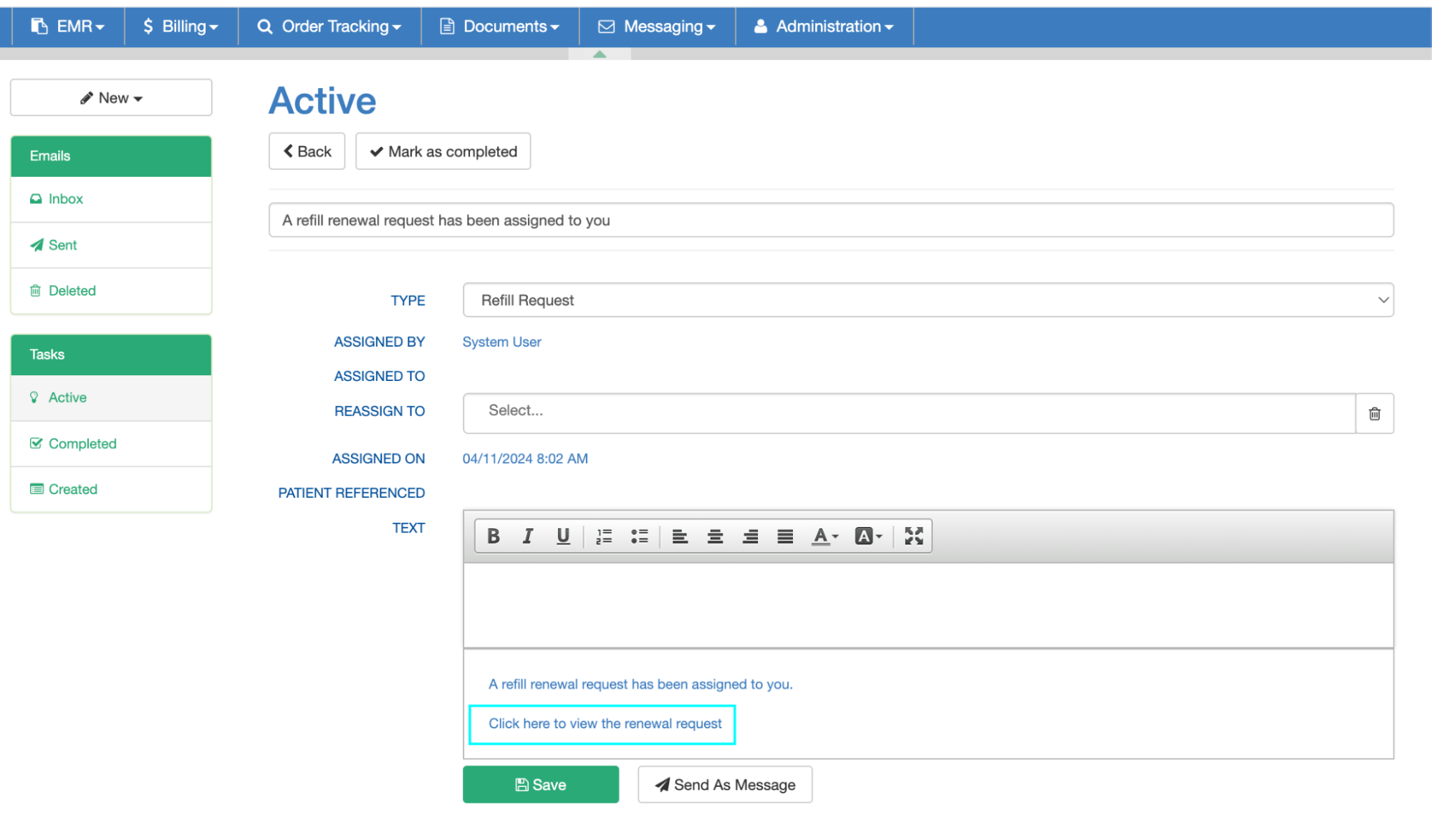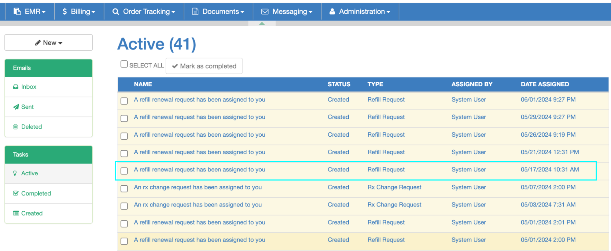 Electronic refill requests sent from pharmacies are received in the Messaging > Tasks Queue. On the