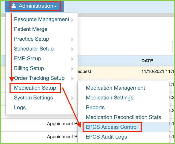 - The ancillary staff with EPCS Access permission or provider who is EPCS Enabled logs in to WRS, goes to Administration > Medication Setup > EPCS Access Control Tab.