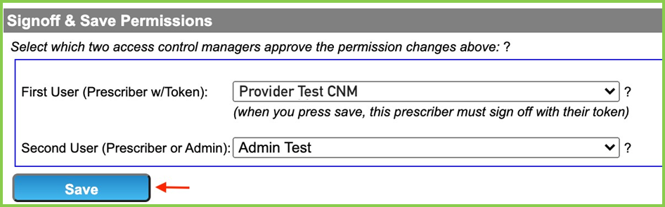- Select the provider with the token as the First User, and the ancillary staff or the EPCS enabled provider is selected as the Second User (this is the person who will be granting EPCS Permissions to the provider). Click Save.
