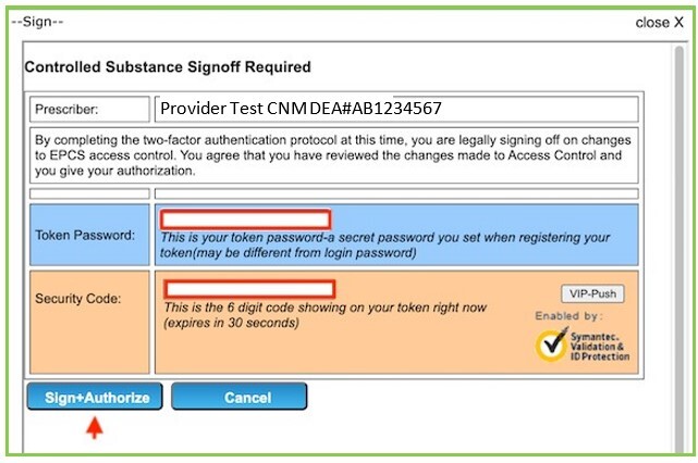 - The prescriber will then enter his Token Password and Security Code (generated from either the VIP Access App or the Key Fob) and click Sign+Authorize.
