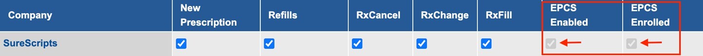 - EPCS Enabled and Enrolled columns should be checked off and grayed out as shown below. This indicates that the setup has been successfully completed.