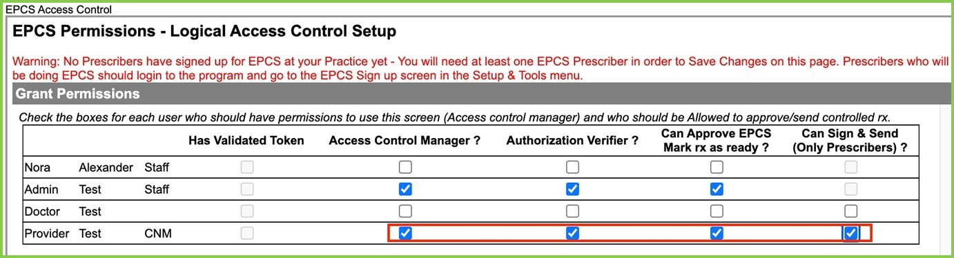 - The Access Control lists all staff with EPCS Permissions, both providers and any other staff. Permissions are indicated by checkboxes as follows; please check per staff member those permissions applicable: