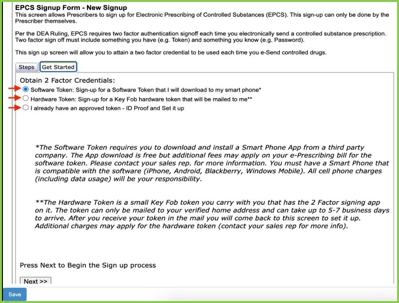 Select the type of token for EPCS Access and click Next >>.