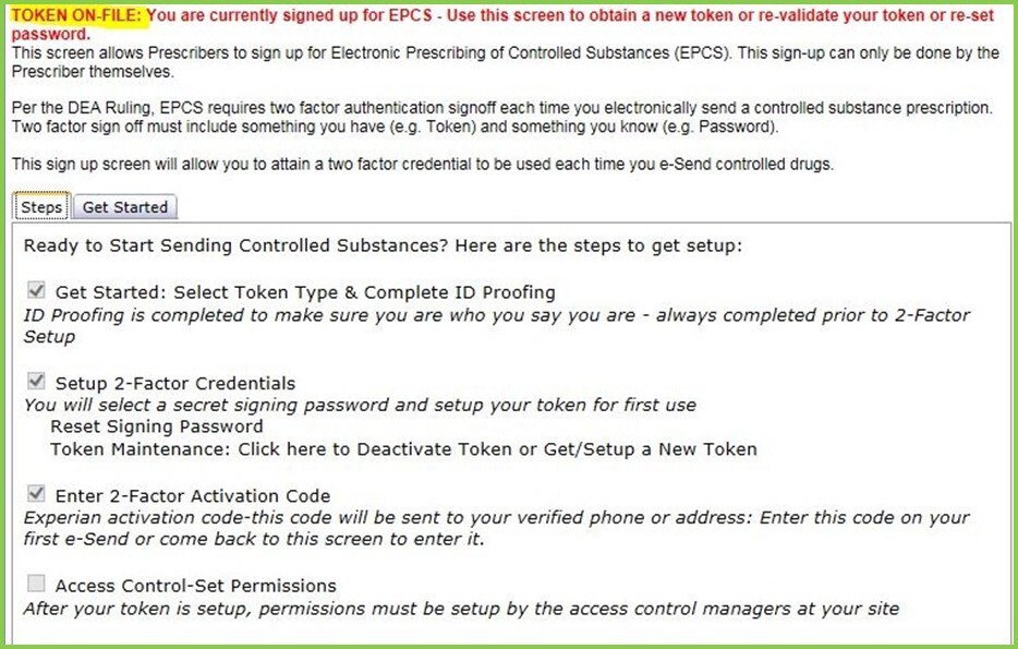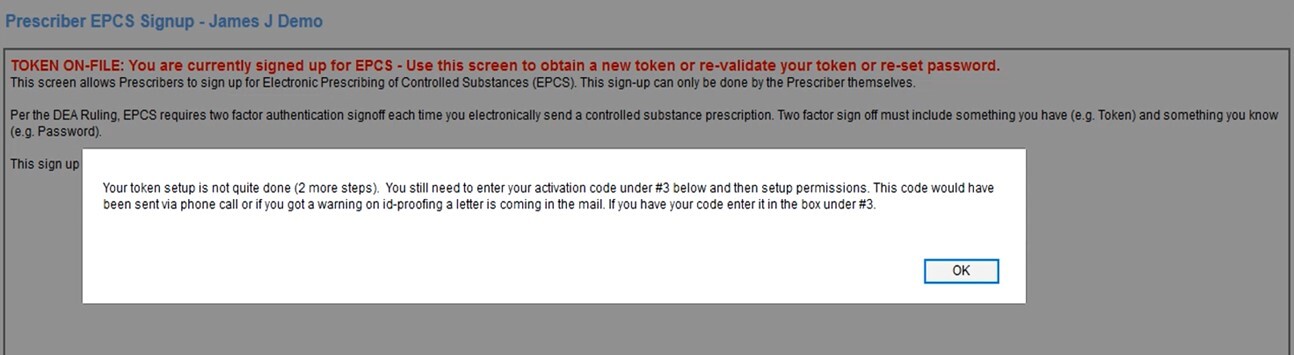 - After successful activation, you will be alerted that your token is on file and you are signed up or enrolled) for EPCS, but may not be enabled. You and a staff member with EPCS granted permissions must proceed to Step 4: EPCS access control and permissions.