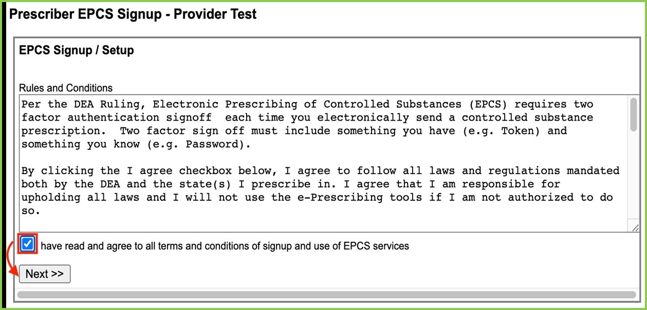 - Kindly read the rules and conditions of EPCS Signup / Setup: DEA Ruling on Electronic Prescribing of Controlled Substances (EPCS), and then click the check box: I have read and agree to all terms and conditions of signup and use of EPCS services, and click Next >>.