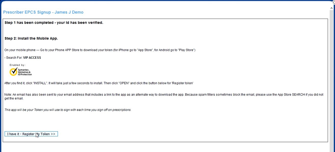 - Once the token has been “SET UP”, the provider will be sent (either to the verified phone number, or the address indicated during setup) the final verification/activation code. This code can be entered through the EPCS signup module (preferred) which will complete the process, or it can be entered during the first instance of signing and e-sending a controlled medication.