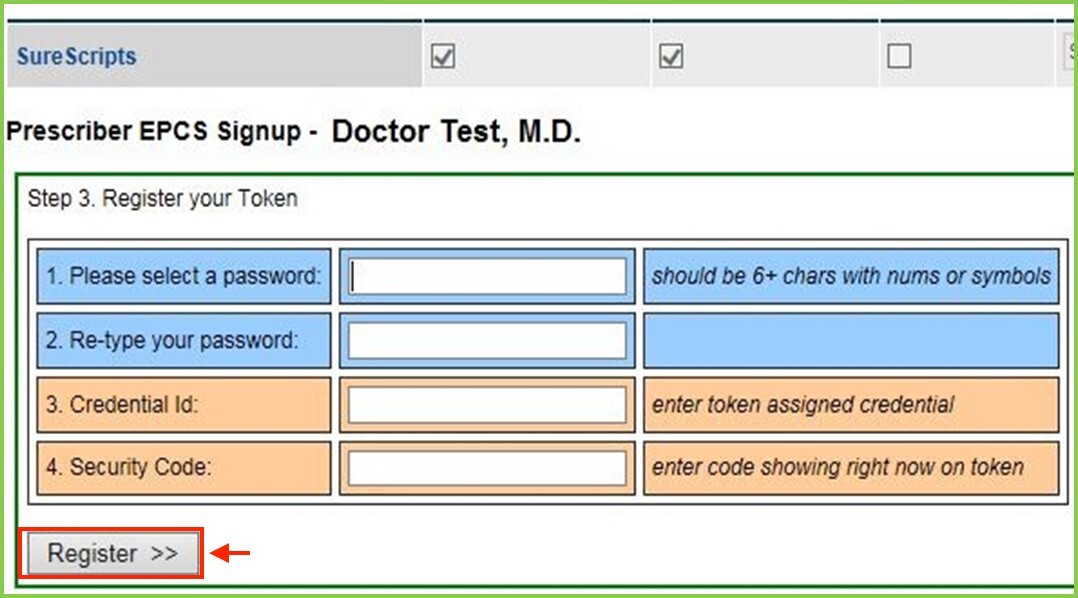 - The provider will now register their software token by creating a personal password and the token’s credential ID and security code, click Register >> before the code expires. .