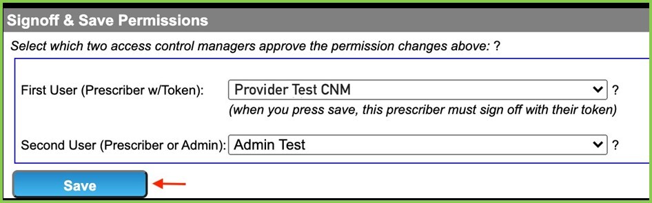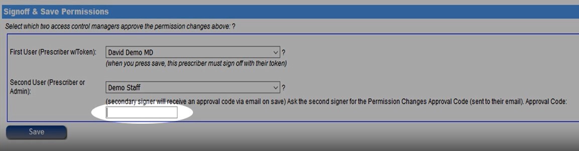 - Select the provider as the First User, if ancillary staff is selected as the Second User. (please see below, this is the person who will be co-signing changes, a one-time instance). Click Save.