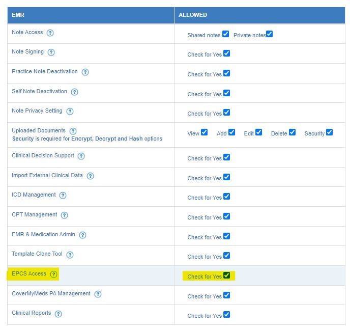 - Scroll down to EMR Permissions > EPCS Access > Check for Yes.