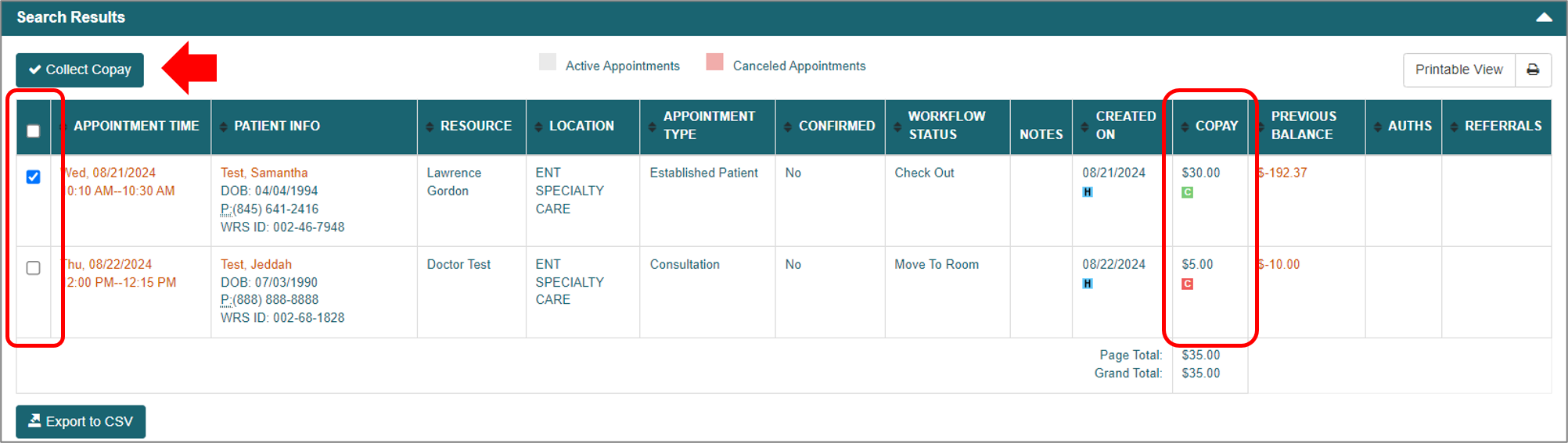 Please note: The copay paid/due filter will only show accurate data for copayments applied to an appointment starting August 13, 2024. This means that copayments applied to an appointment prior may not reflect the correct copay status when using this filter.