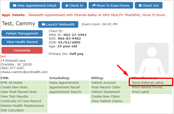 - For patient with active appointments, go to Today’s Appointment List, select the patient name then right+click, choose Send Referral Letter