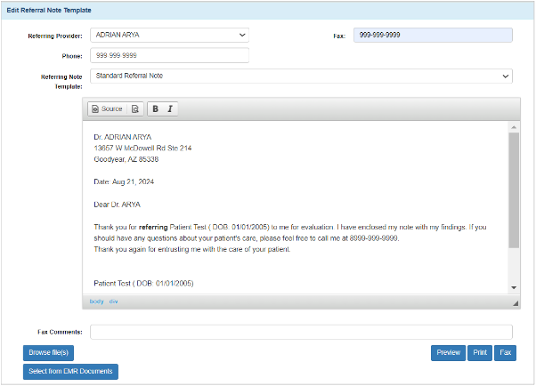 If you need to make updates to the provider’s information for a specific referral letter, you can do so directly in the Referral Note Template window. Please note that these changes are temporary and will only apply to the current referral letter.