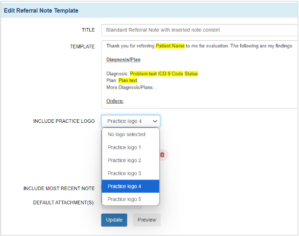 - The logos that are available from the dropdown can be managed from your EHR’s Administration > Practice Setup > Edit Practice Info