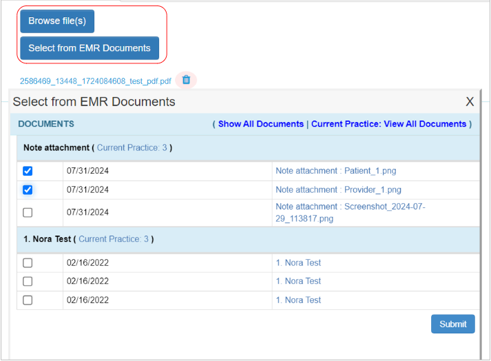 - Click Select From EMR Documents, then tick the document(s) you want to attach, and click Submit.