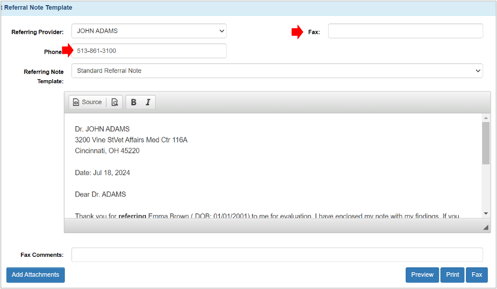 8. Click the Fax button to send the referral letter. A confirmation message will display upon successful delivery.