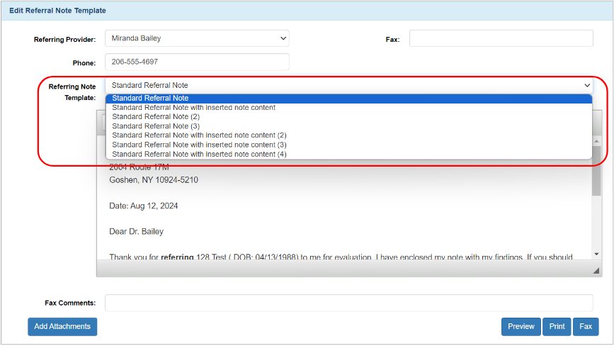 1. Simply look for the Referring Note Template dropdown, and select the template you wish to use.