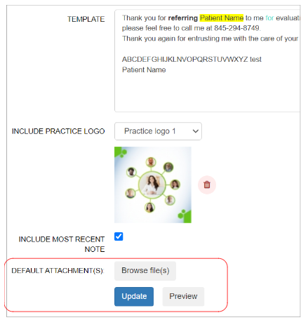 e. Default Attachments – this section allows you to designate specific documents or files that will be automatically attached to every referral letter generated from this template.