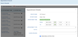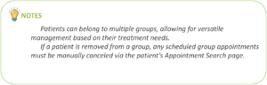 Note: If a patient is removed from a group, any scheduled group appointments must be manually canceled via the patient’s Appointment Search page.