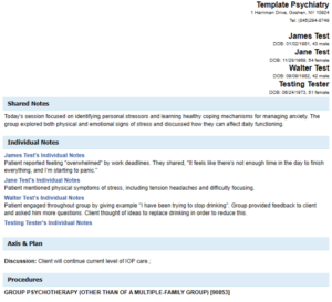 All CPT codes added in the Group Procedures section will automatically carry over to each patient’s individual note after the group note is exported. This ensures accurate billing documentation.