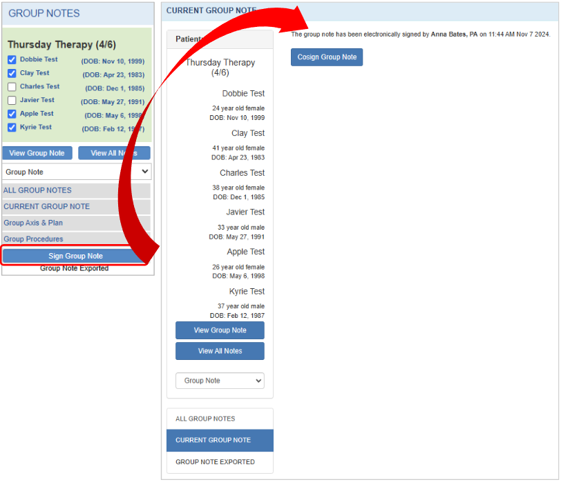 - Access the Group Note. Sign the Group Note using the provided button