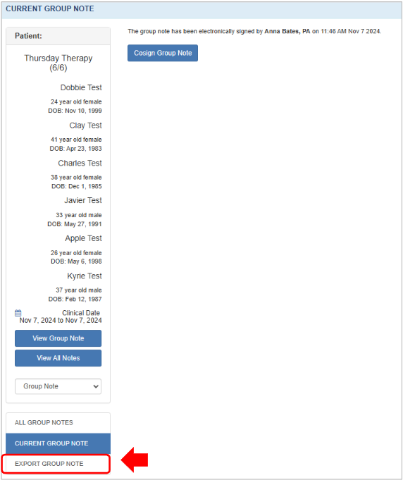 Once signed, you can then use the Export Group Note option to distribute the signed note to each patient’s chart. This ensures that the note is finalized before export.