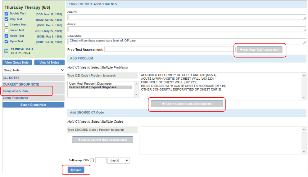 All data entered in the Axis & Plan section will be automatically transferred to each patient’s individual note during the export process. This ensures that diagnoses and assessments are recorded consistently across the group and individual notes.