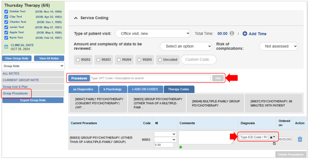 - Note: Codes applied to the group note will automatically be added to the Orders & Procedures page of each patient’s individual note.