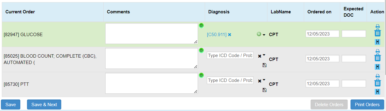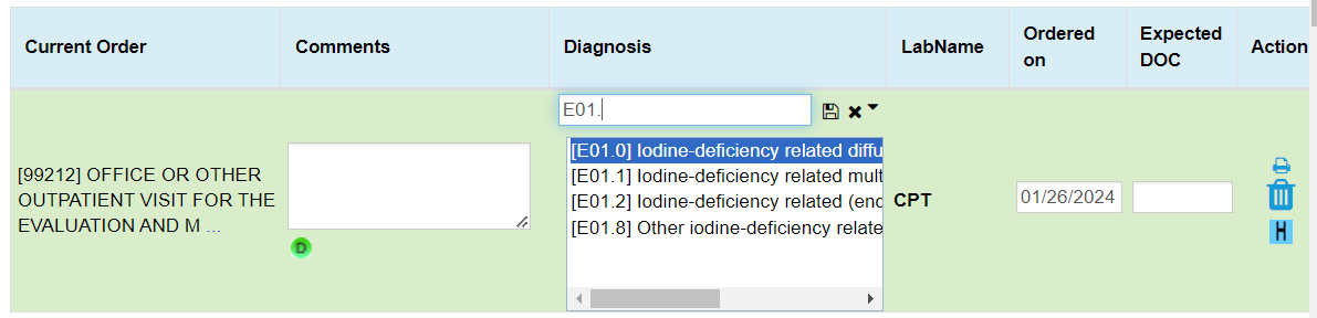 Users can also add a Diagnosis under the Diagnosis column by either typing the ICD code or description and then selecting from the dropdown.