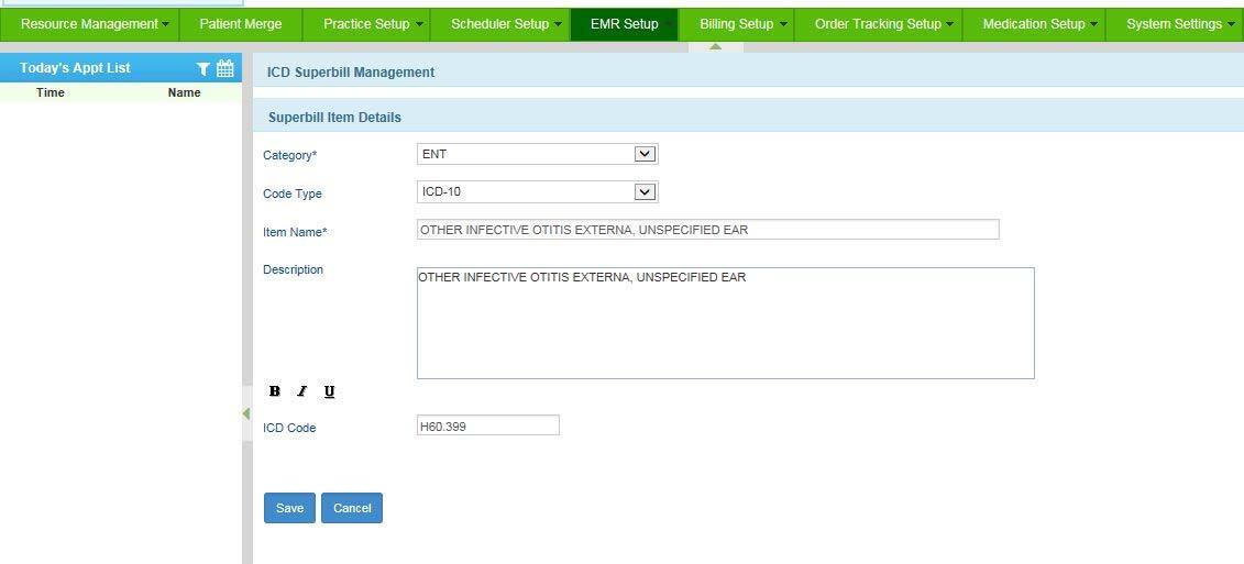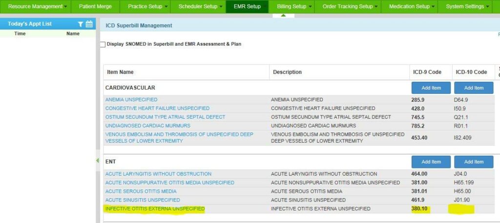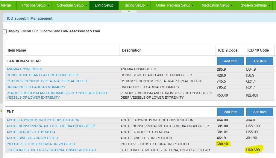 - To review, go to ADMINISTRATION → EMR SETUP → ICD SUPERBILL. For any codes not mapped to an ICD-10 code please add the correct ICD-10 code. Usually, the main reason for no mapping to a current ICD-9 code, is that the code will be deleted or replaced by more accurate, and concise ICD-10 codes