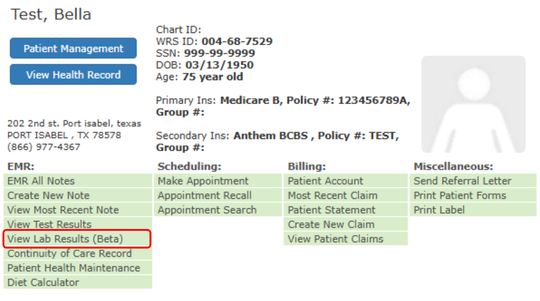 - Search for a patient: Right+click on patient’s name → View Lab Results (Beta)