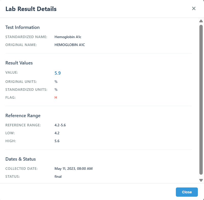 - A pop-up window will appear showing details about that test, including units, reference ranges, and the exact date it was recorded.
