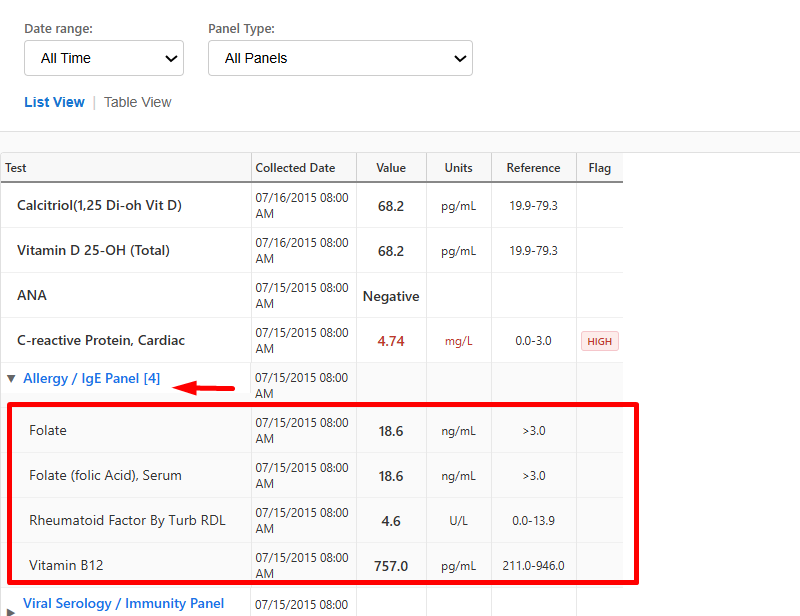 - Table View groups tests by panel name, making it easier to quickly find a specific test or panel regardless of when it was performed.