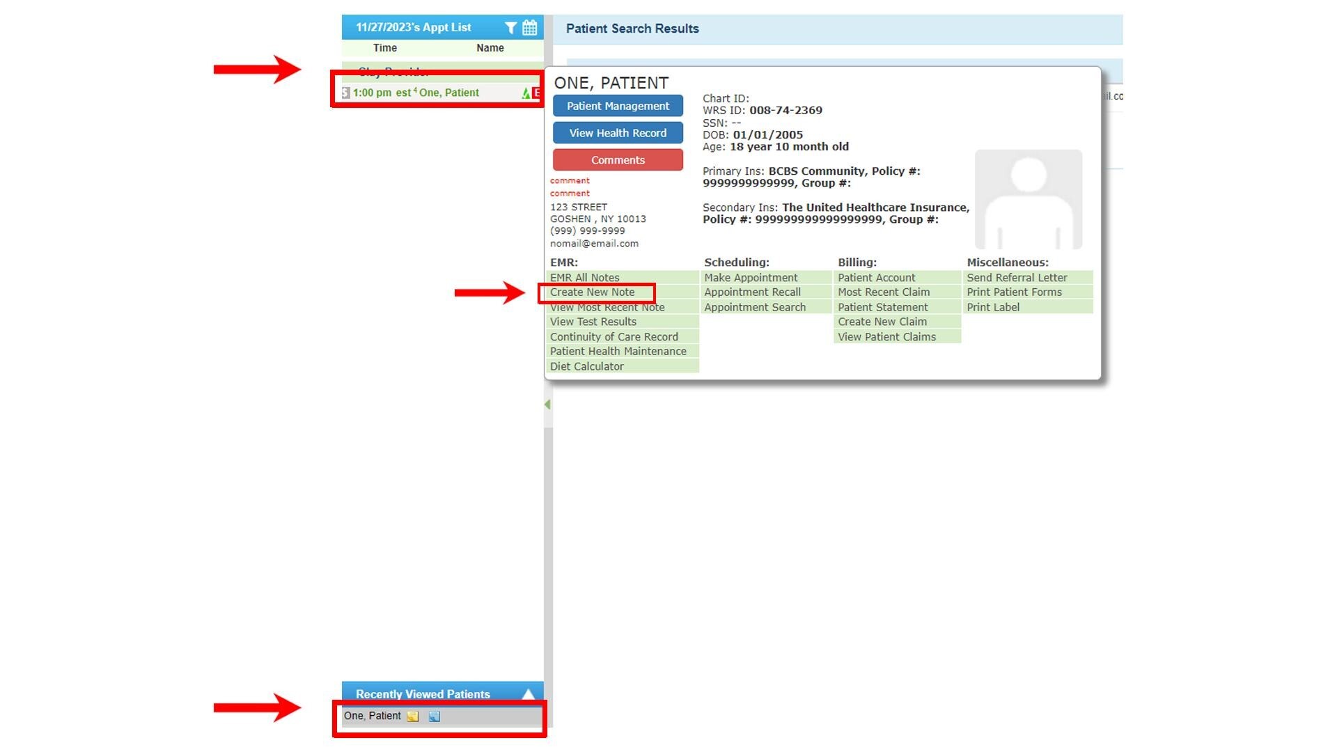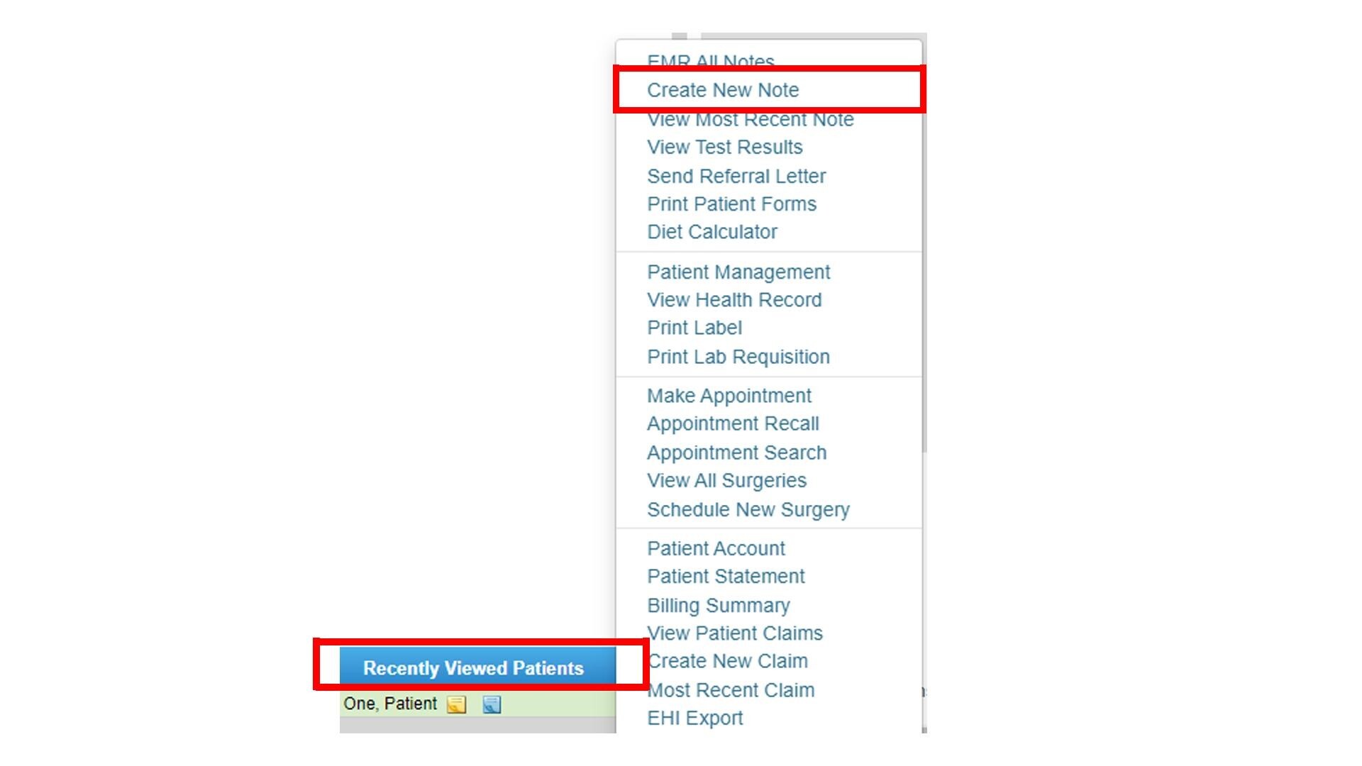 Option 3: Point to the Patient’s Name under Recently Viewed Patients. Under the EMR section, select Create New Note.