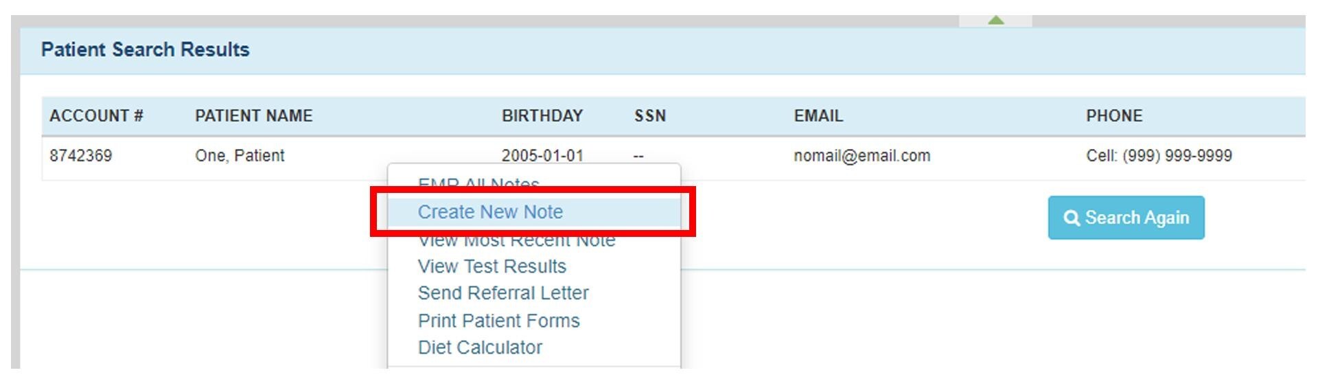 Option 1: Right click on the Patient’s Name and select Create New Note.