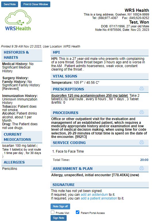 - Medical History – if the feature is enabled, the patient’s Medical history will be reflected in the note.