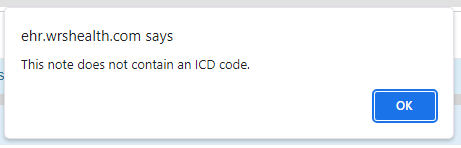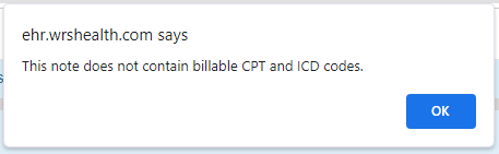 - Missing Billable CPT Code at Note Signing – If activated, this feature ensures that the alert will pop up if there are missing billable CPT and ICD codes on the patient’s note. Users will have 2 options: Alert Warning and Stop Note Signing.