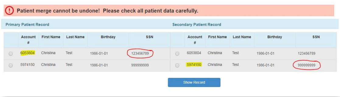 - After designating your primary and secondary accounts, verify that the patient is a duplicate by verifying the data – click ‘Show Record’.